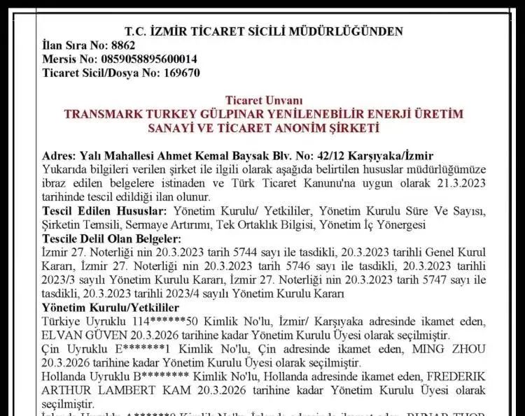 近日,開山集團(tuán)股份有限公司的全資公司OME (Eurasia) Pte., Ltd.(以下簡稱“OME Eurasia”)與Sonsuz Enerji Holing B.V.(以下簡稱“Sonsuz”)已在伊茲密爾完成Transmark turkey Gulpinar Yenilenebilir Enerji Urtetim Sanayi(以下簡稱“TTG”)公司的股權(quán)變更手續(xù),完成了OME Eurasia與Sonsuz此前簽署的《TTG公司股權(quán)認(rèn)購暨股東協(xié)議》所規(guī)定的交割程序。TTG新股東結(jié)構(gòu)及董事會成員已在土耳其工商機(jī)構(gòu)進(jìn)行登報(bào)。至此OME Eurasia已成為擁有TTG49%股份的股東,Sonsuz控股51%。
